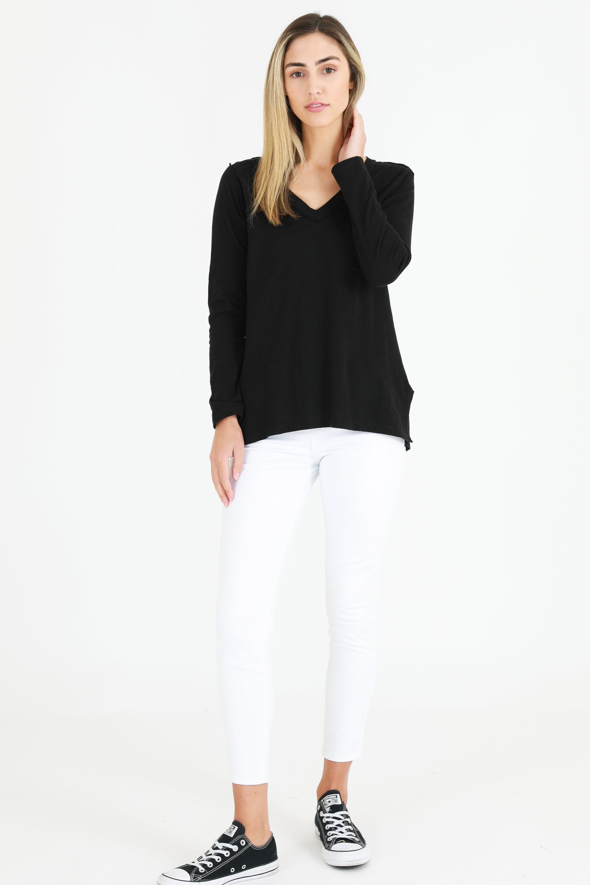 With a slightly rounded, scooped V neckline and a straight raw edged hem-line that runs slightly longer at the back.  Belle features side splits for a relaxed fit and looks great as a layering piece or worn on its own.