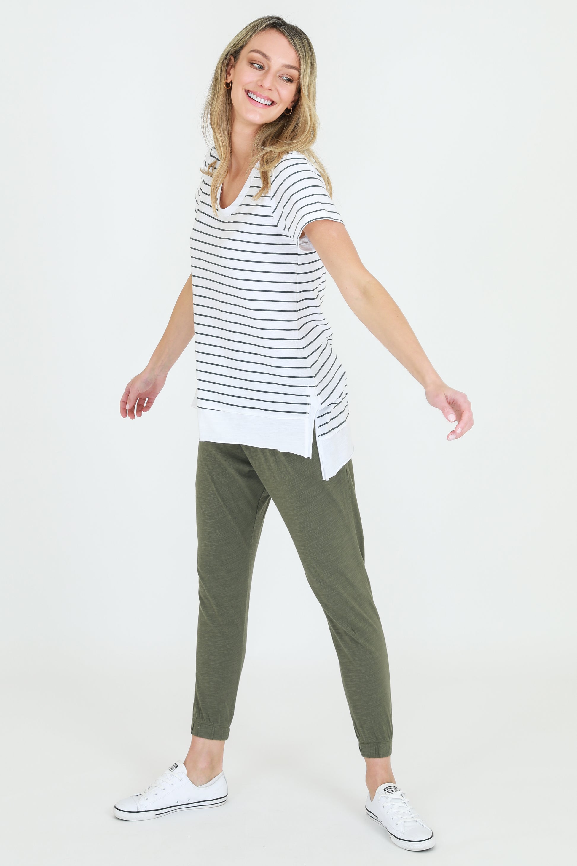 Introducing the Brighton Tee — your new go-to essential for everyday style! This tee features a slightly rounded v-neckline and a unique raw-edged hemline for a flattering silhouette, with a longer back and side splits that offer a relaxed fit.