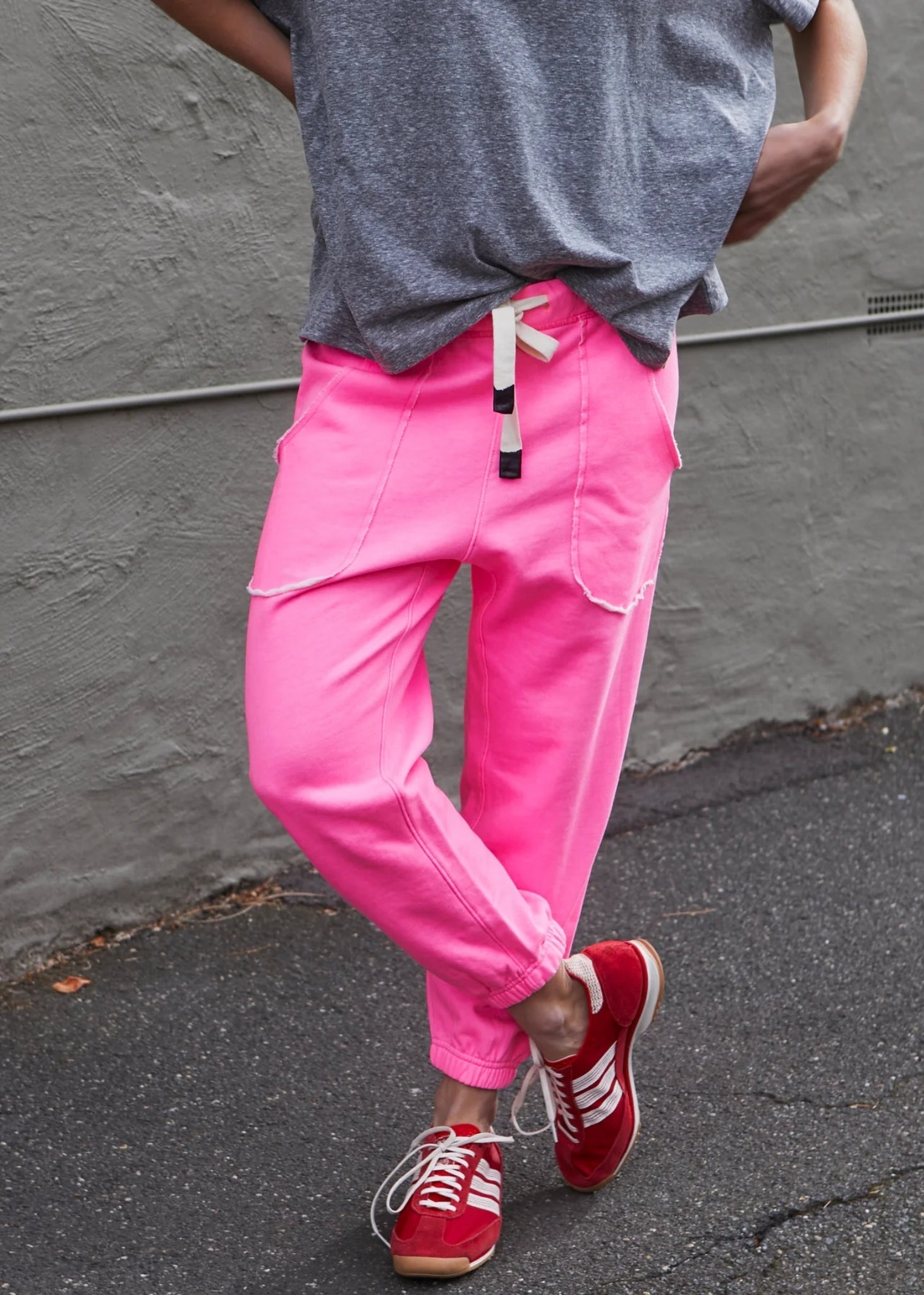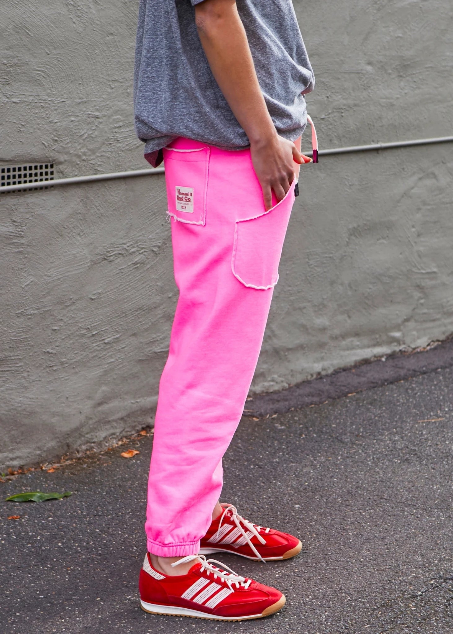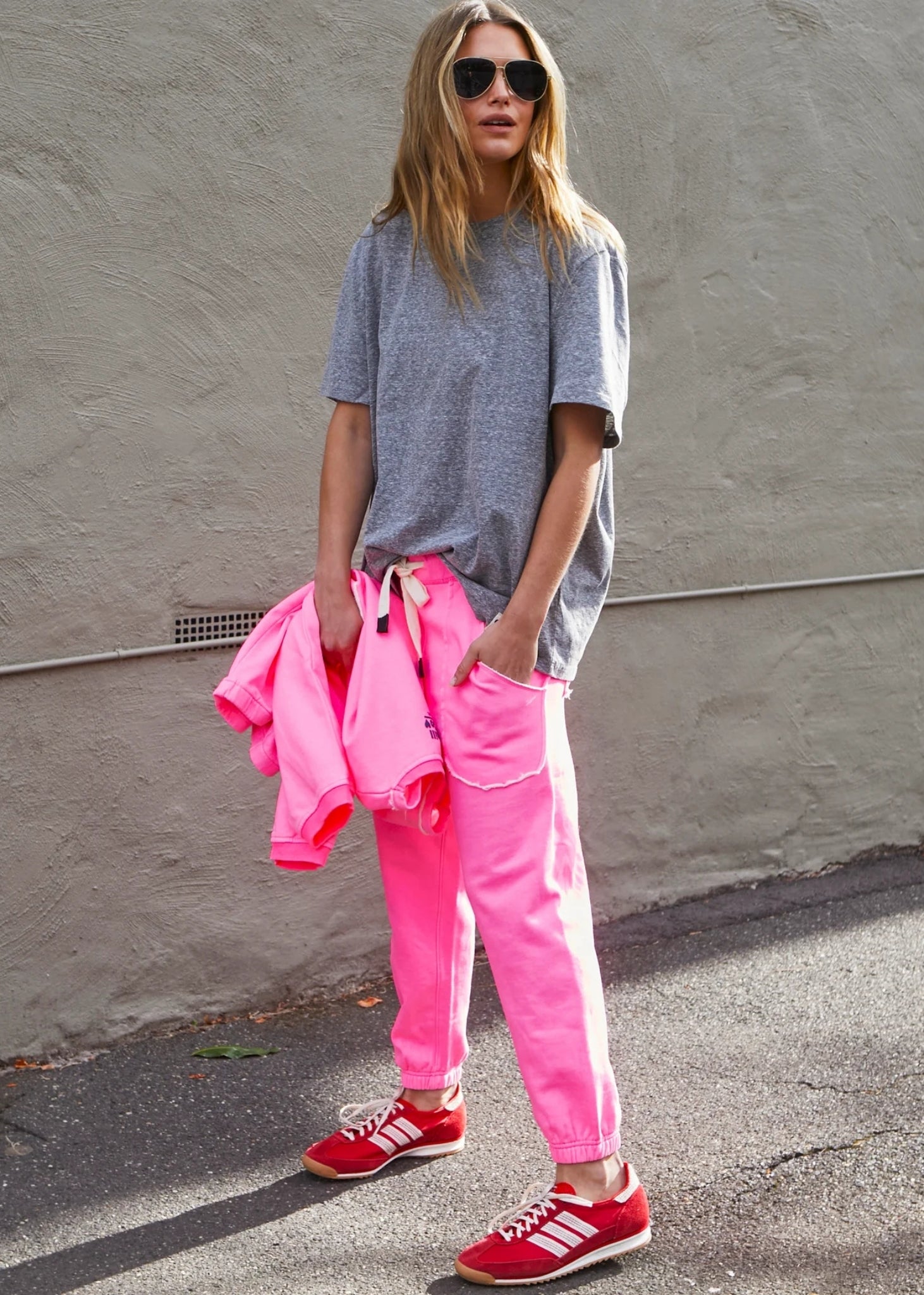 Bold yet relaxed, with every piece feeling unique and effortlessly cool. New track pant in a beautiful garment-dyed Neon Orange designed to fade. Featuring raw edge seams on the front and back pockets, they will fray slightly more after washing to give a vintage look. Looks great worn back with the matching v neck sweat!