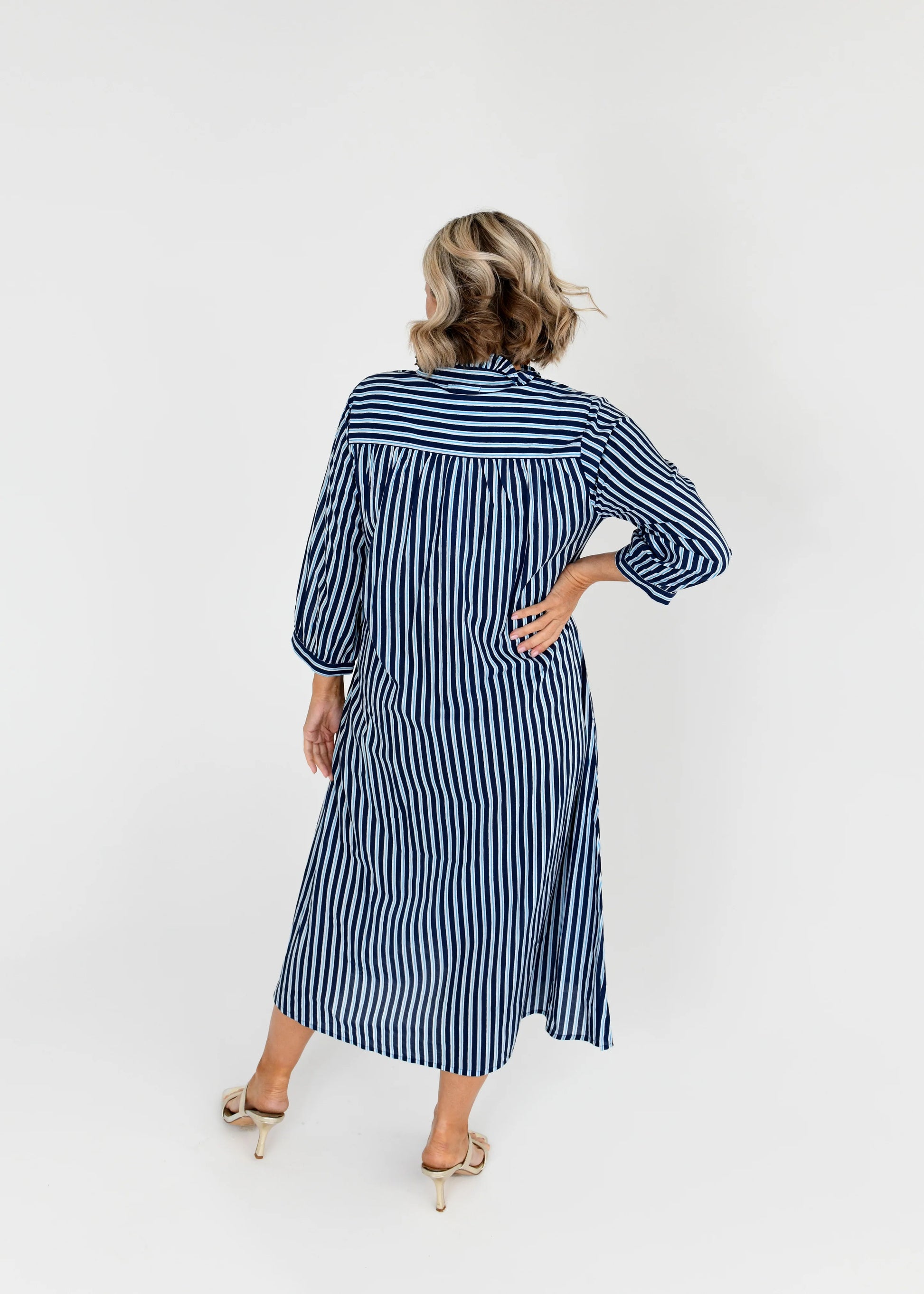 he Clover Button Up Shirt Dress is an effortless summer staple, designed for comfort, breathability, and timeless style. Crafted from soft, lightweight cotton, this navy and white striped midi dress keeps you cool on warm days while offering an easy, no-fuss feel.