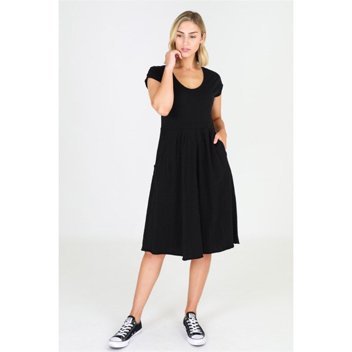 Crafted from pure cotton goodness, this easy to wear dress features a scoop neckline, pockets, knee length and gathering at the waistline for a flattering relaxed fit and is sure to be a firm favourite all year round. Wear on its own or throw on a jacket or cardigan when the sun goes down.