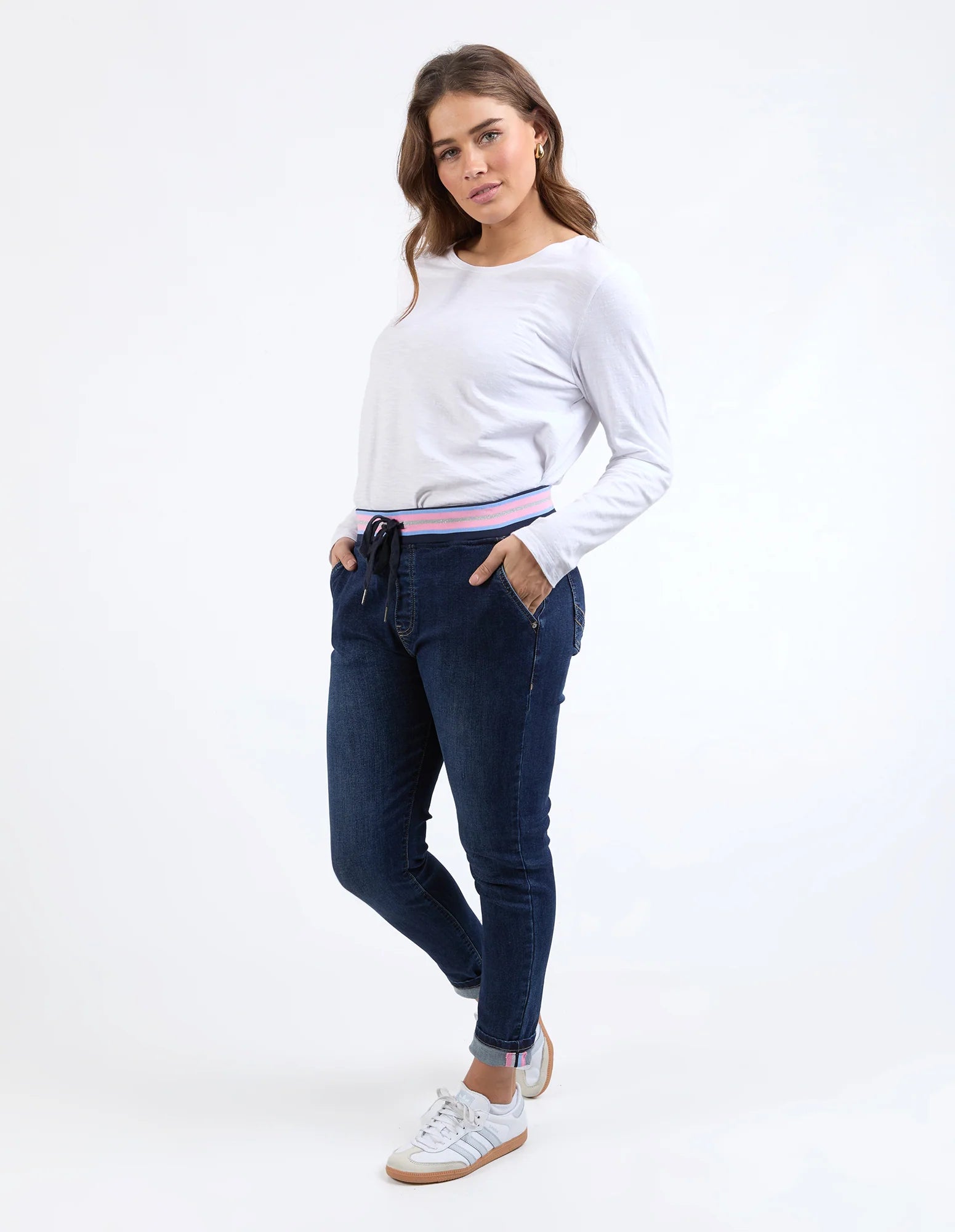 Get ready to strut your stuff in the Melody Denim Jogger—your new must-have for style and comfort! These easy to style, stretch pants come with a sleek slim leg and a super comfy ribbed waistband adorned with a fun metallic stripe. Trust us, they're as fabulous as they sound! 🎉