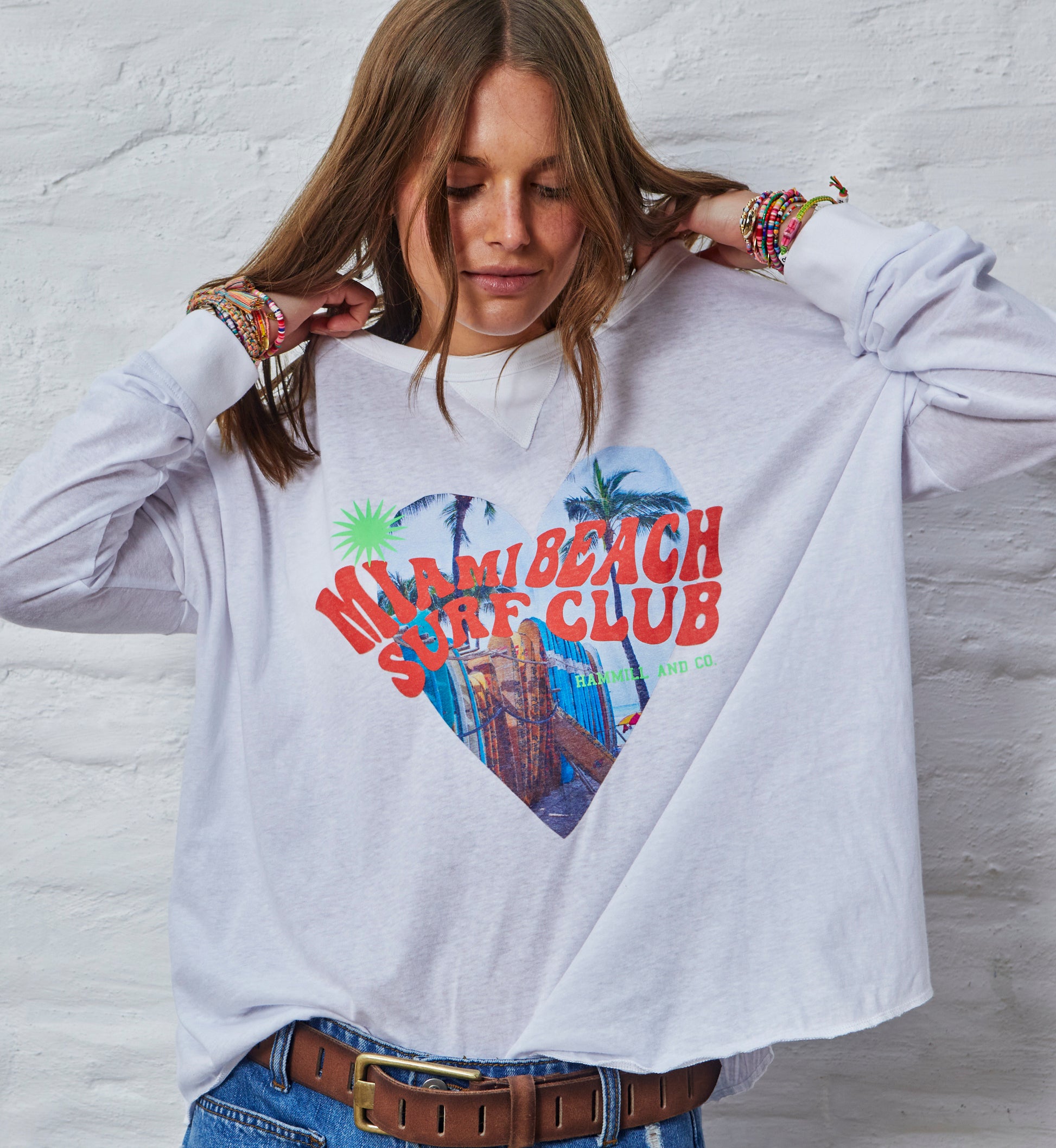 Introducing our newest Miami long sleeve tee from Hammill & Co, featuring a retro-inspired Miami Beach heart print. Crafted in white marle, this tee offers a slouchy drop shoulder fit with ribbed cuffs, a raw overlocked hem, and a cotton rib V detail for added style.