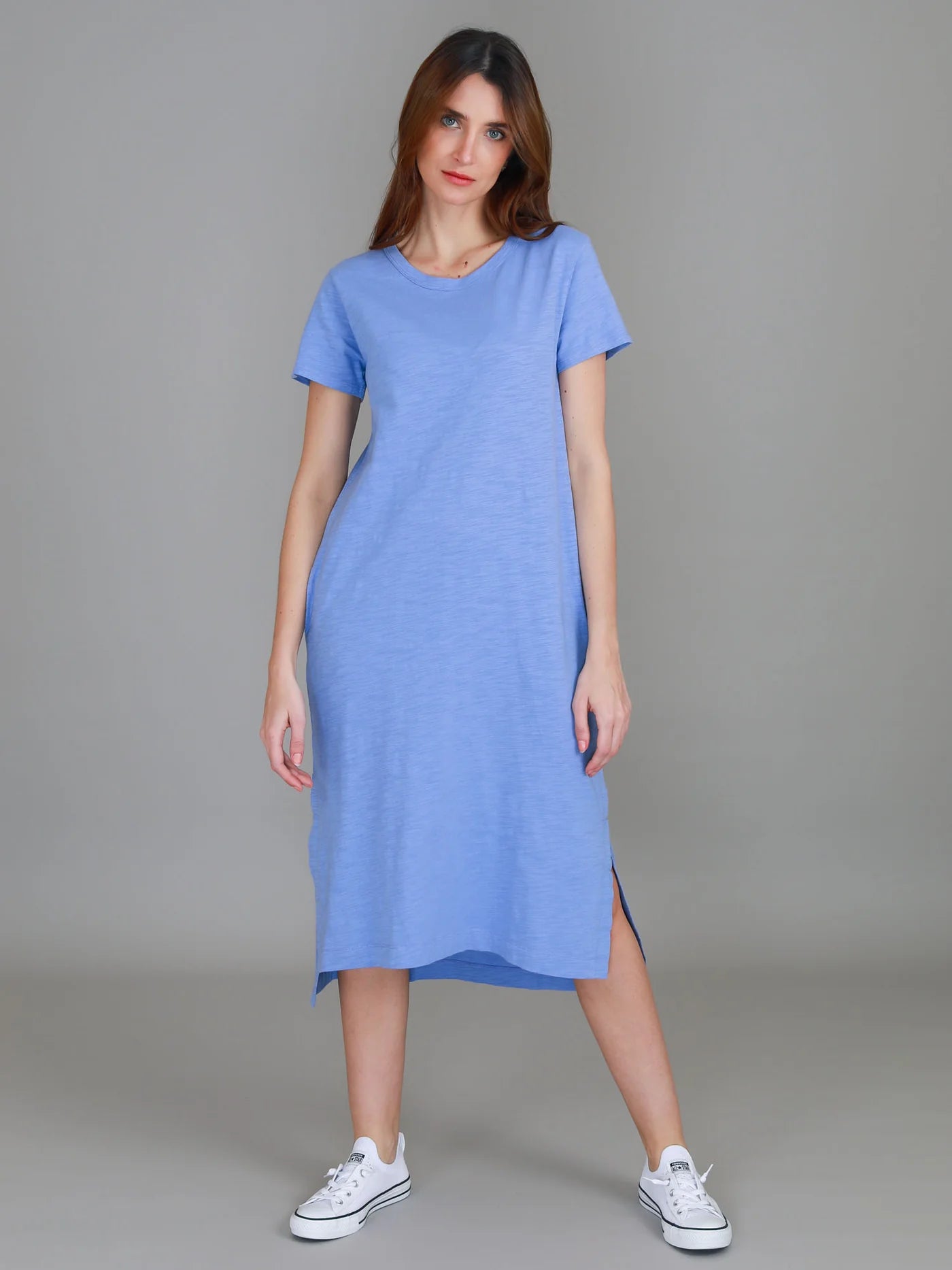The Miley Dress is a versatile wardrobe staple, featuring a flattering midi length and breezy short sleeves. The comfortable t-shirt dress design is elevated with a classic crew neck and modern split sides for added style. The hi lo hem adds a touch of sophistication to this must-have piece.