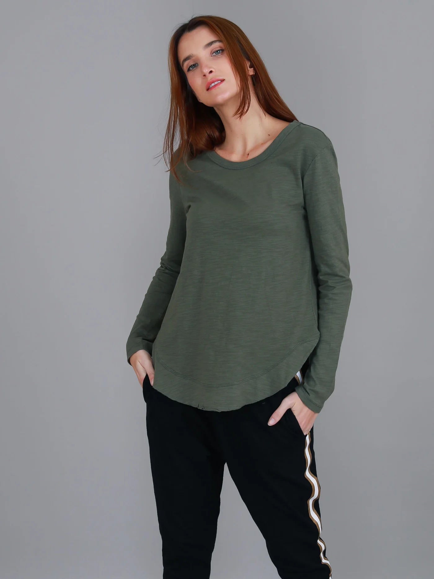 Made from luxurious premium cotton, this tee combines style with versatility like no other. Its classic crew neck and long sleeves are perfect for any season, while the on trend raw hem and curved design add a modern twist. Featuring a round neck line and a raw stitched, curved hem Mosman is the perfect layering piece or wear it on its own with jeans or a skirt.