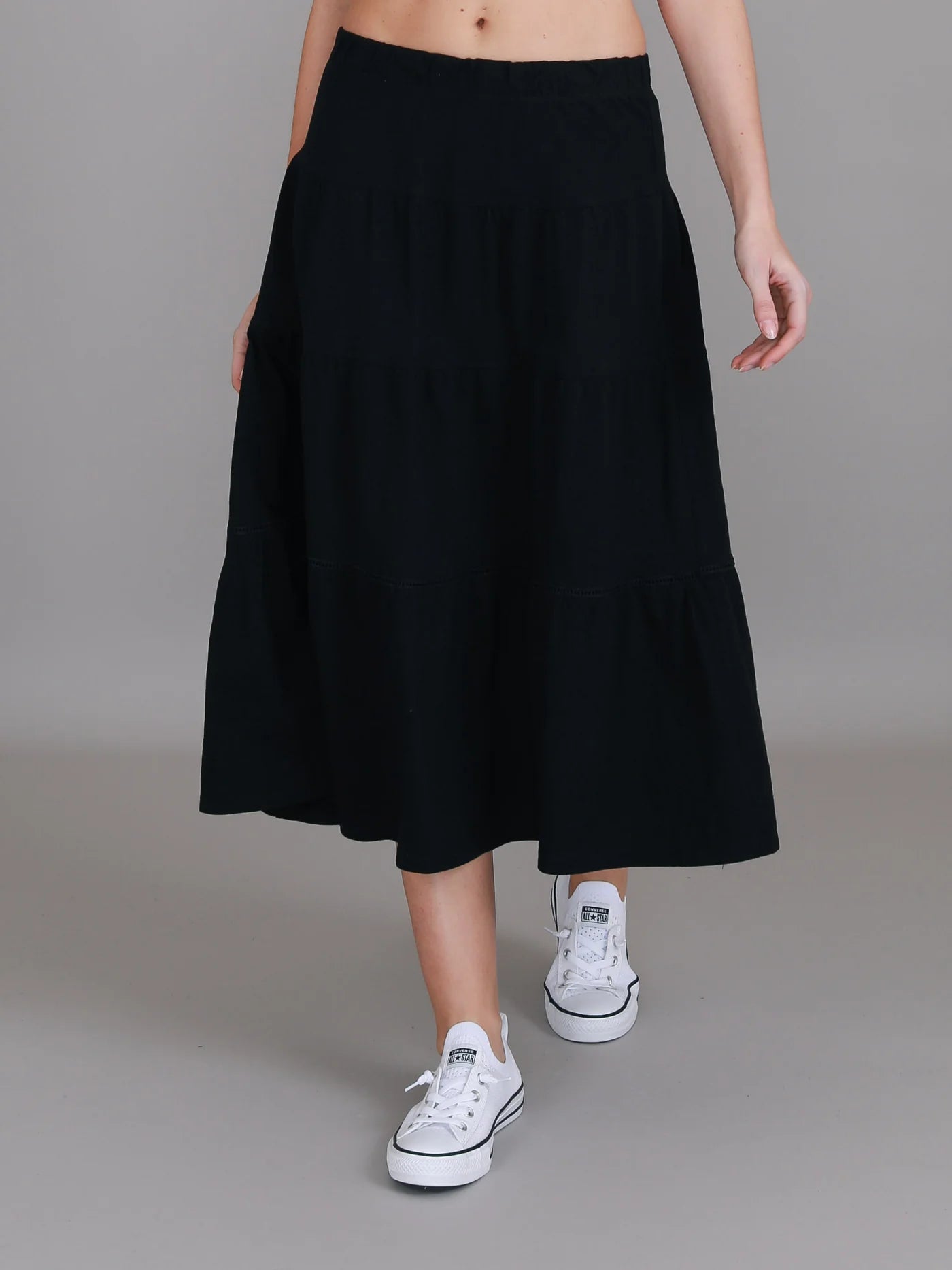 The Piper Skirt is a refined take on casual comfort. Crafted in soft cotton jersey with a gently flared A-line silhouette, this midi-length skirt features tiered panel detailing for subtle movement and drape. Its wide elastic waistband sits flat against the waist, delivering an unrestricted fit that flatters all day. The tiered styling adds a relaxed, textured finish that pairs effortlessly with everyday basics.