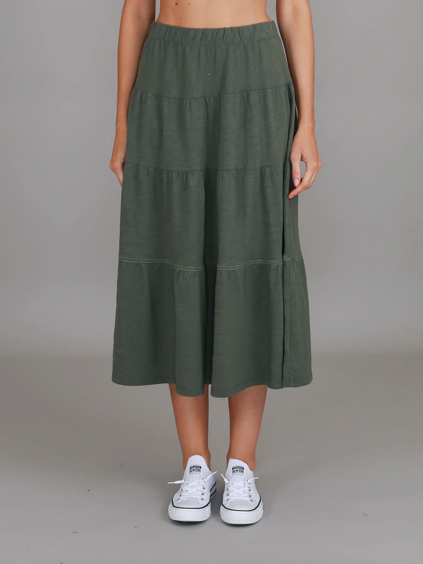The Piper Skirt is a refined take on casual comfort. Crafted in soft cotton jersey with a gently flared A-line silhouette, this midi-length skirt features tiered panel detailing for subtle movement and drape. Its wide elastic waistband sits flat against the waist, delivering an unrestricted fit that flatters all day. The tiered styling adds a relaxed, textured finish that pairs effortlessly with everyday basics.
