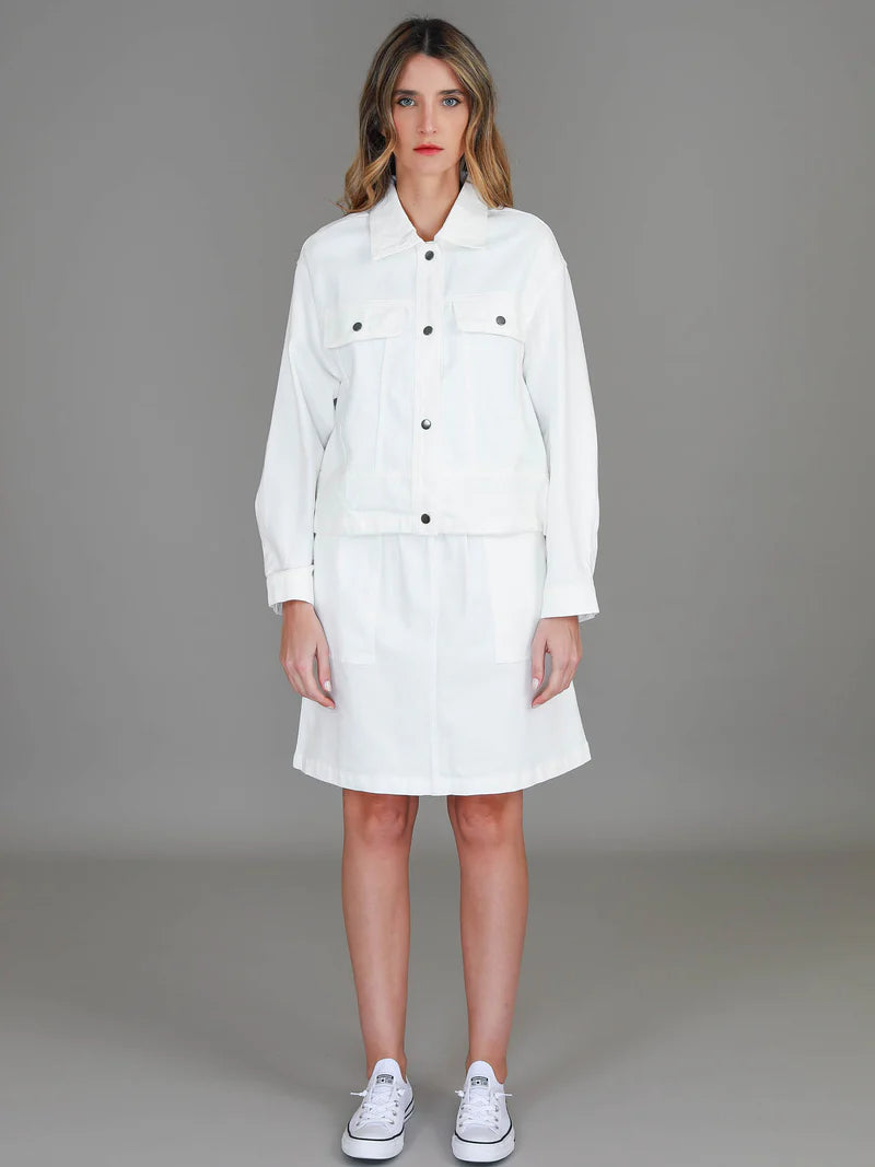 Designed for effortless wear, it has a slightly boxy fit, button front closure, and handy chest pockets for a utilitarian vibe.